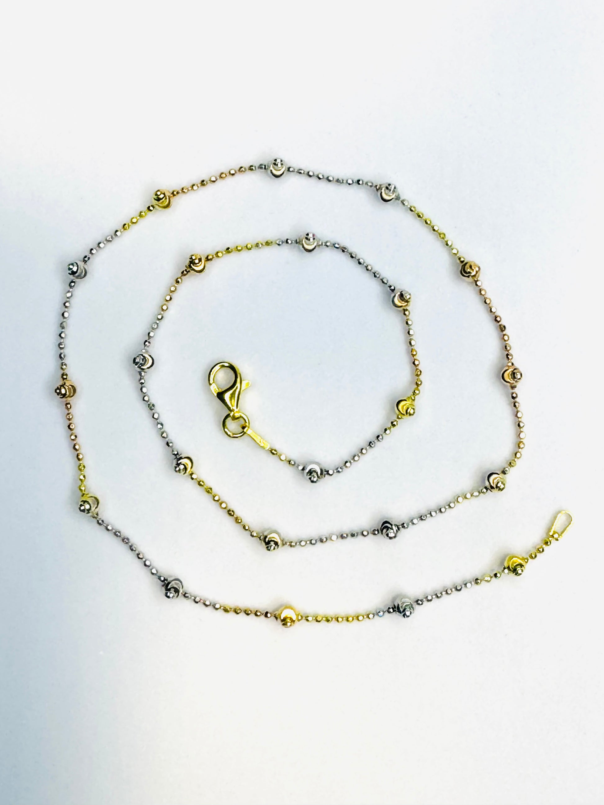 una cadena tipo satelite elaborada en Plata 925 con chapado en Oro de tres tonos. Su diseño combina el encanto clásico del dorado, el refinamiento del plateado y la calidez del oro rosa, creando un equilibrio perfecto que realza cualquier estilo. cada pequeño detalle cuenta: las bolitas facetadas alternadas en los tres colores aportan destellos sutiles y elegantes, mientras la cadena fina y ligera se adapta cómodamente al cuello. Disponible en 16" y 18", puede usarse como gargantilla o collar, ideal para llevar sola o en layering con otras piezas.